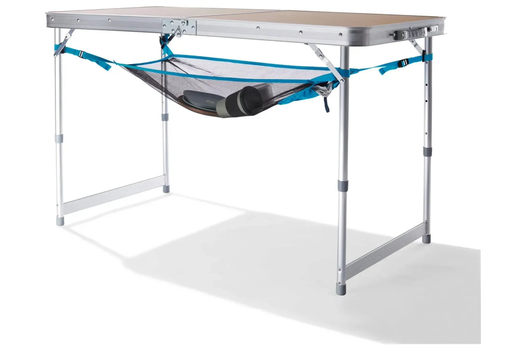 Dieses Camping-Tischnetz bietet eine clevere und platzsparende Ablagemöglichkeit direkt unter dem Campingtisch. Ideal, um kleinere Gegenstände wie Geschirr, Lebensmittel oder Zubehör griffbereit und ordentlich zu verstauen.