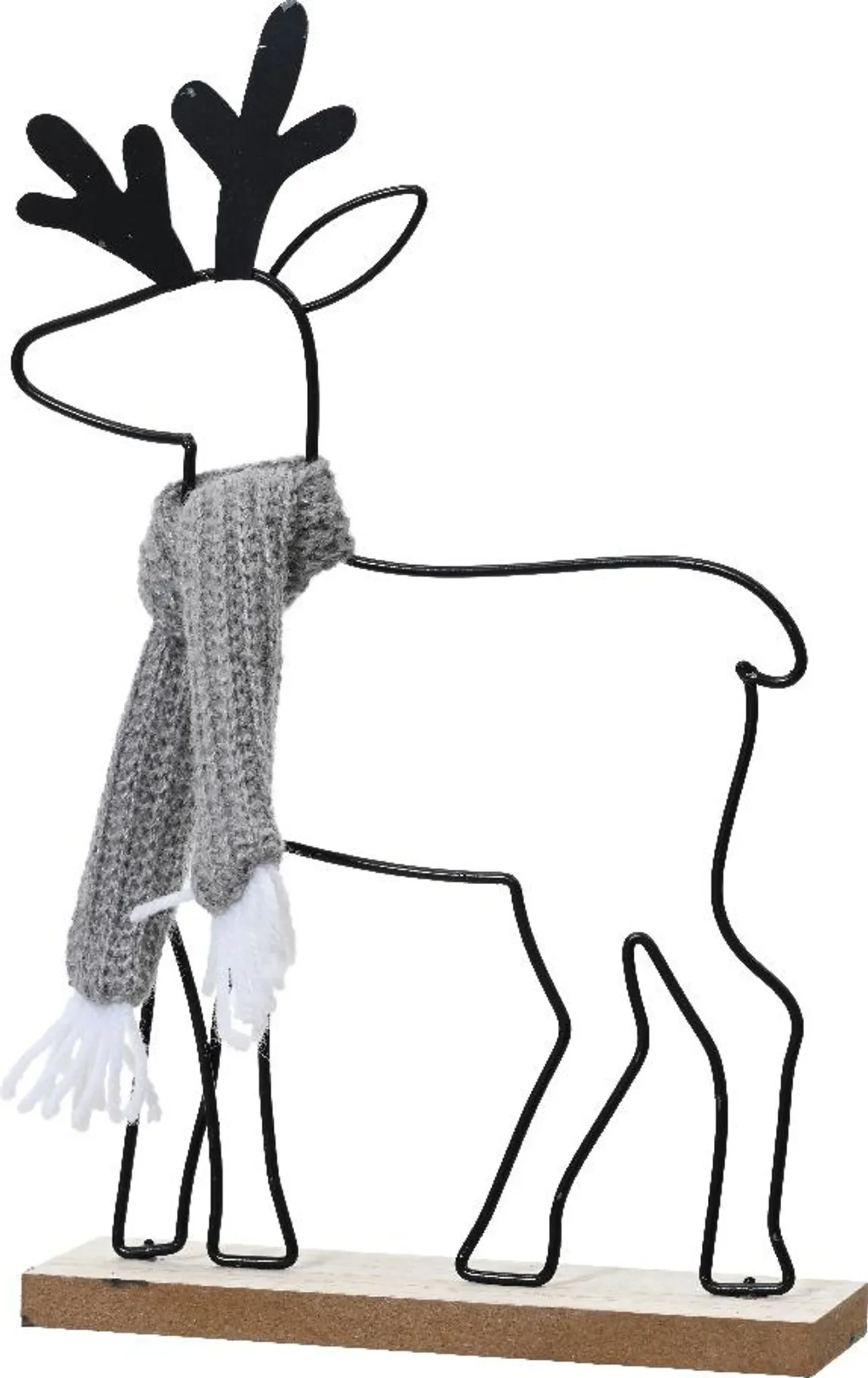 Diese elegante Dekofigur in Form eines Hirsches ist eine stilvolle Bereicherung für die Weihnachts- und Winterdekoration. Der schlanke Metallkörper in Schwarz wird durch einen grauen Schal ergänzt, der der Figur eine warme, winterliche Note verleiht.