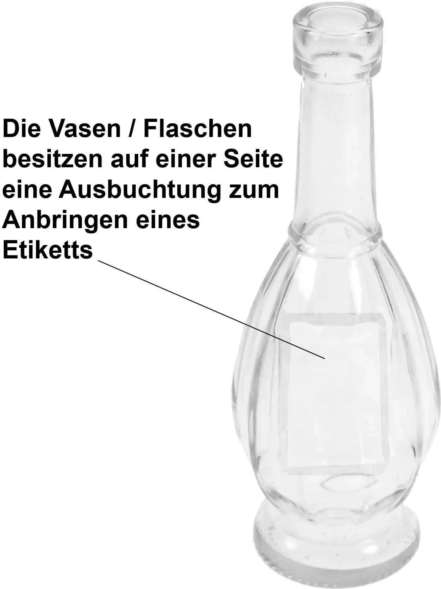 Besonders praktisch ist die ins Glas eingelassene Etikettenaussparung auf einer Seite. Diese glatte Fläche ohne Rillen eignet sich perfekt zum Anbringen von Etiketten oder Aufklebern. Dadurch lässt sich die Vase individuell personalisieren – ideal für Hochzeiten, Feiern, Events oder als stilvolle Tischdekoration.